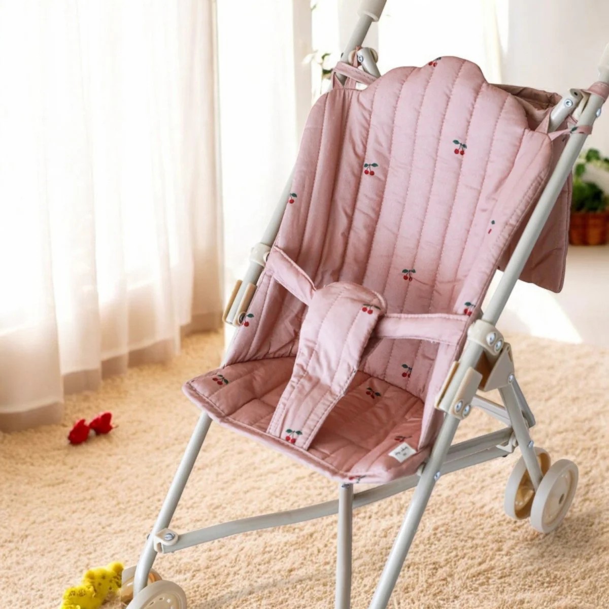 Each Cherry Blush Baby Doll Stroller showcases delicate cherry motifs scattered across quilted pink fabric like petals in a spring garden, creating an atmosphere of gentle refinement.